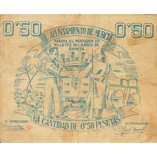 0`50 EL AYUNTAMIENTO DE MURCIA PAGARA AL PORTADOR EN BILLETES DEL BANCO DE ESPAÑA LA CANTIDAD DE 0`50 PESETAS (Translation: The City Council of Murcia Will pay the bearer in banknotes of the Bank of Spain The amount of 0.50 Pesetas) |