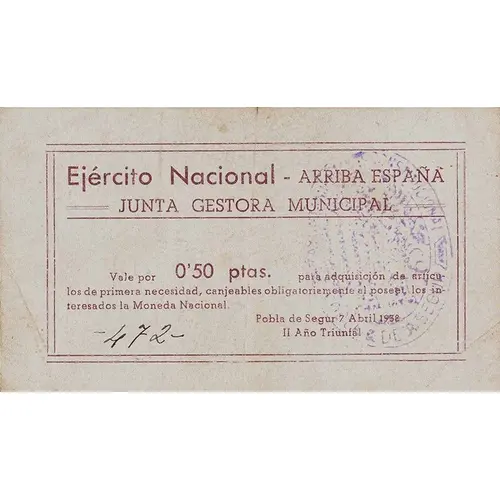 Ejército Nacional - ARRIBA ESPAÑA JUNTA GESTORA MUNICIPAL Vale por 0`50 ptas. para adquisición de artículos de primera necesidad, canjeables obligatoriamente al poseer los interesados la Moneda Nacional. Pobla de Segur 7 Abril 1938 II Año Triunfal (Translation: National Army -`Arriba España` Municipal Management Board It is valid for 0.50 Pesetas for the purchase of basic necessities, which can be exchanged compulsorily when those interested have the National Currency. Pobla de Segur, April 7, 1938 II Triumphal Year) |