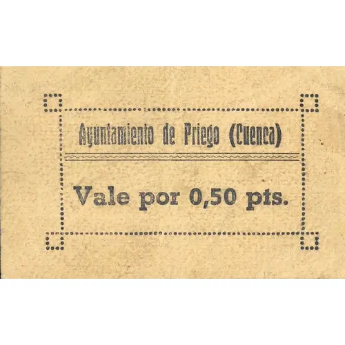 Ayuntamiento de Priego (Cuenca) Vale por 0,50 pts. (Translation: City Council of Priego (Cuenca) Voucher for 0.50 Pesetas) |