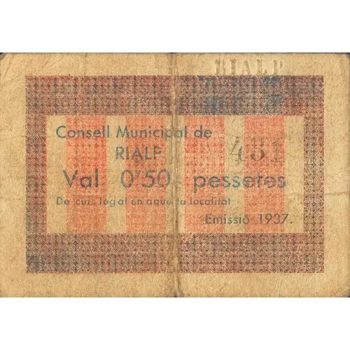 Consell Municipal de RIALP Val 0`50 pessetes De curs legal en aquesta localitat EMISSIO 1937. (Translation: Municipal Council of Rialp Voucher 0.50 Pesetas Legal course in this location Issue 1937.) |