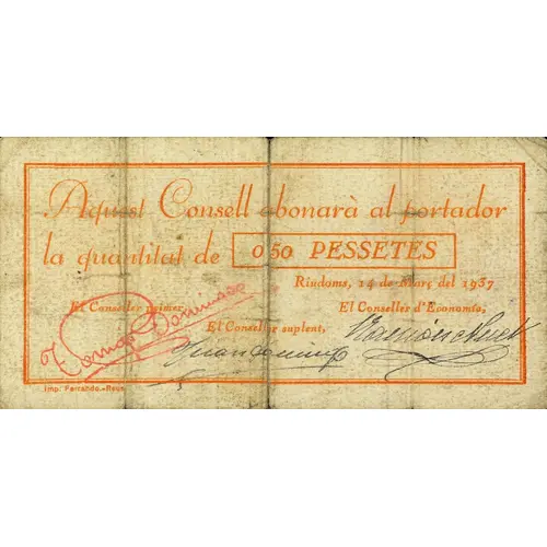 | Obverse lettering | Aquest Consell abonarà al portador la quantitat de 0`50 PESSETES Riudoms, 14 de Març del 1937 (Translation: This Council will pay the bearer the amount of 0.50 Pesetas Riudoms, March 14, 1937) |