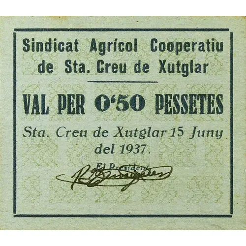 | Obverse lettering | Sindicat Agrícol Cooperatiu de Sta. Creu de Xutglar VAL PER 0`50 PESSETES Sta. Creu de Xutglar 15 Juny del 1937 El President, (Translation: Agricultural Cooperative Union of Sta. Creu de Xutglar Voucher for 0.50 Pesetas Sta. Creu de Xutglar , June 15, 1937 The President,) |