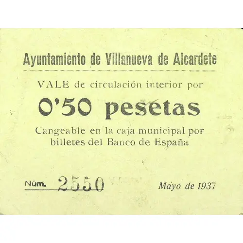 (Translation: City Council of Villanueva de Alcardete Voucher for internal circulation 0.50 Pesetas Exchangeable in the municipal treasury for banknotes from the Bank of Spain May 1937)