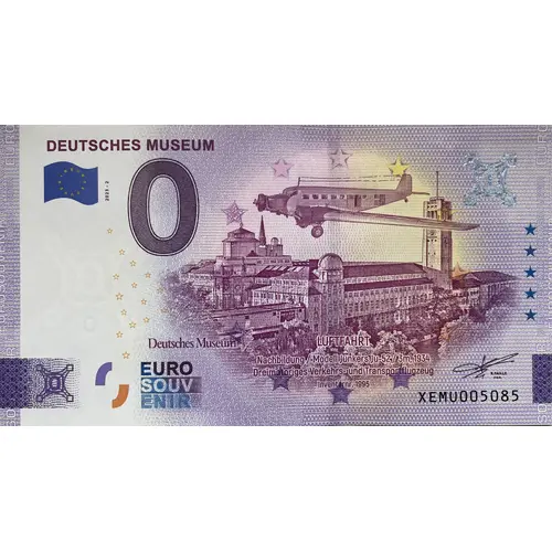 The Obverse showcases the north-western side of The German Museum (“Deutsches Museum“) in Munich, Bavaria on the museum’s island within the river Isar, partially visible in the bottom right corner. The famous aircraft Junkers model Ju-52 (nicknamed Aunt Ju - “Tante Ju“) exhibit, heart and soul of the museum’s aviation department, seems to be flying over the building. |