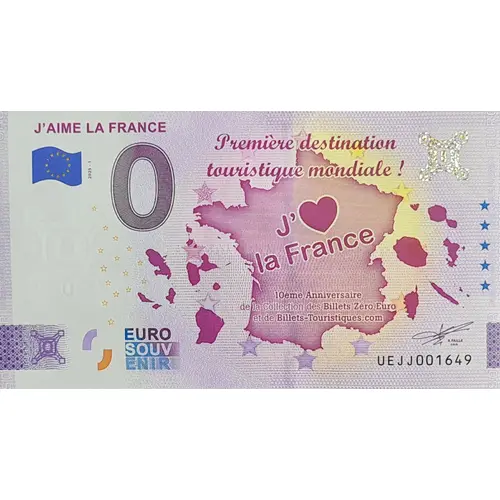 J`AIME LA FRANCE EUROSOUVENIR 2025-1 0 Première destination touristique mondiale ! J` ♥ la France 10éme Anniversaire de la Collection des Billets Zéro Euro et de Billets-Touristique.com EURO SOUV ENIR R. FAILLE C.E.O. UEJJ |