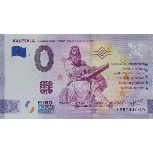 KALEVALA SUOMEN KANSALLISEEPOS - FINLAND`S NATIONAL EPIC EUROSOUVENIR 2022-1 EURO SOUV ENIR Vaka vanha Väinämöinen elelevi aikojansa noilla Väinölän ahoilla, Kalevalan kankahilla. Laulelevi virsiänsä, laulelevi, taitelevi. `VÄINÄMÖISEN SOITTO - VÄINÄMÖINEN`S PLAY` `Robert Wilhelm Ekman 1866` R. FAILLE C.E.O. LEBY (Translation: Steady old Väinämöinen alive for its time in those fields of Väinölä, With Kalevala fabrics. He sang his hymn, singing, artistic.) |