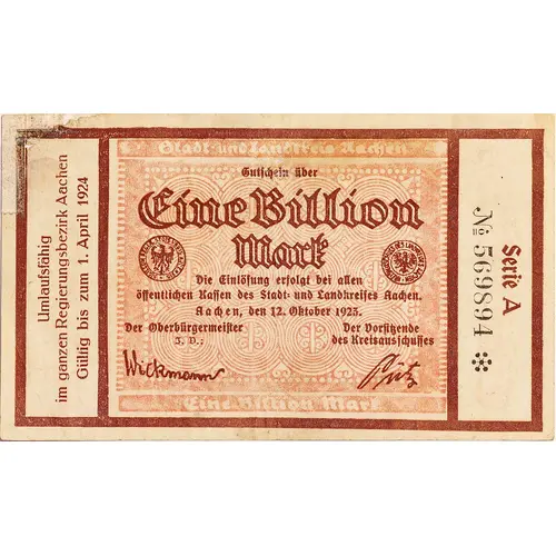 | Obverse lettering | Umlauffähig im ganzen Regierungsbezirk Aachen :: Gültig bis zum 1. April 1924 Gutschein über eine Billion Mark Die Einlösung erfolgt bei allen öffentlichen Kassen des Stadt und Landkreißes Aachen. Aachen, den 12. Oktober 1923 Der Oberbürgermeister Der Vorsitzende des Kreisaussschußes Serie A N° < Number > * |