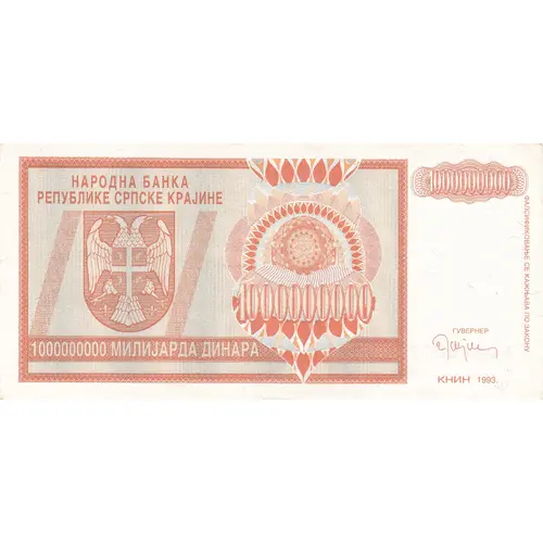 | Obverse lettering | НАРОДНА БАНКА РЕПУБЛИКЕ СРПСКЕ КРАЈИНЕ 1 000 000 000 MИЛИJAPДA ДИHAPA ГУВЕРНЕР КНИН 1993 ФАЛСИФИКОВАЊЕ СЕ КАЖЊАВА ПО ЗАКОНУ (Translation: NATIONAL BANK OF THE REPUBLIC OF SERBIAN KRAJINA 1 000 000 000 ONE BILLION DINARS KNIN 1993 GOVERNOR COUNTERFEITING IS PUNISHABLE BY LAW) |