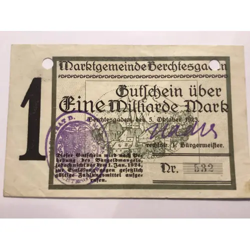 Marktgemeinde Berchtesgaden Gutschein über Eine Milliarde Mark Berchtesgaden den 5.Oktober 1923 Rechtsk.Bürgermeister Dieser Gutschein wird nach Behebung des Bargeldmangels jedoch nicht vor dem 1.Jan.1924,zur Einlösung gegen gesetzlich gültige Zahlungsmittel aufgerufen. |
