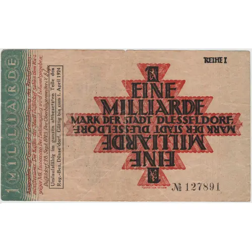 | Obverse lettering | 1 REIHE I EINE MILLIARDE MARK DER STADT DUESSELDORF, |