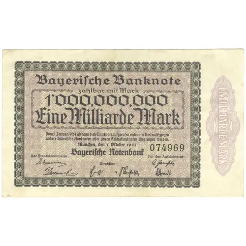 | Obverse lettering | Bayeriſche Banknote zahlbar mit Mark 1`000,000,000 Eine Milliarde Mark Bayeriſche Notenbank |