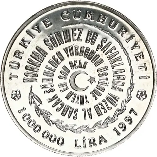 | Chữ khắc mặt trước | TÜRKİYE CUMHURİYETİ KORKMA SÖNMEZ BU ŞAFAKLARDA YÜZEN AL SANCAK SÖNMEDEN YURDUMUN ÜSTÜNDE TÜTEN EN SON OCAK 1 000 000 LİRA 1997 |