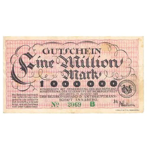 | Obverse lettering | Gutschein Eine Million Mark 500 000 Ausgegeben mit Genehmigung des Reichsfinanz- ministerums. Der Gegenwert ist sichergestellt Annaberg, 27. August 1923 Der Bezirksverband d. Amtshauptmann- schaft Annaberg |