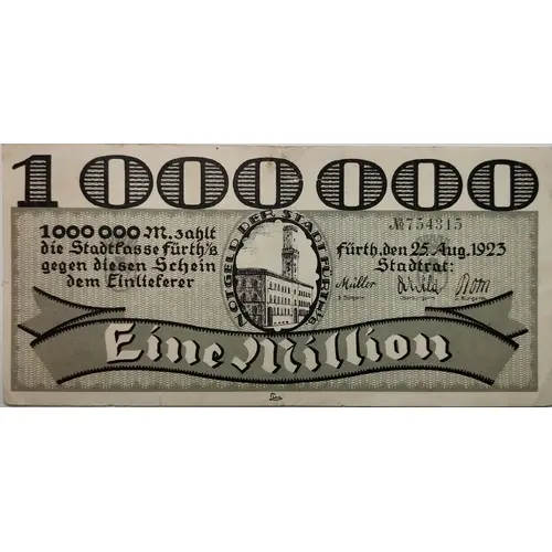 | Obverse lettering | 1 000 000 1000 000 M. zahlt die Stadtkasse Fürth i/B. gegen diesen Schein dem Einlieferer NOTGELD DER STADT FÜRTH i/B. Fürth, den 25.Aug.1923 Stadtrat: 3.Bürgerm Oberbürgerm. 2.Bürgerm. Eine Million Lion |