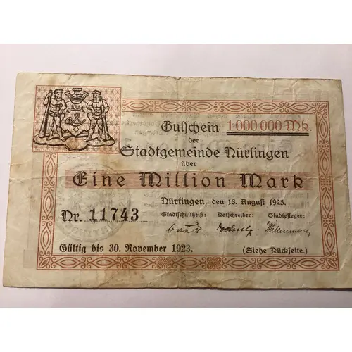 Gegen Abgabe dieses Gutscheines erhalt der Inhaber bei der Stadtpflege Nürtingen,der Handwerkerbank Nürtingen oder bei der Oberamtssparkasse Nürtingen EINE MILLION MARK Der Gutschein ist Gültig bis 30.November 1923.Er kann Schon vor diesem Zeitpunkt durch Bekanntmachung des Stadtschultbeiszenamts Nürtingen im “Nürtinger Tagblatt”mit vierzehntägiger Frist zur Einlösung aufgerufen werden und verliert in diesem Falle Feine Gültigkeit mit Ablauf der bekanntgegeben Frist. |