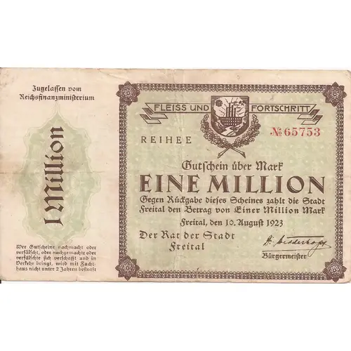 (within the bordered area) FLEISS UND FORTSCHRITT REIHE E Gutschein über Mark EINE MILLION Gegen Rückgabe dieses Scheines zahlt die Stadt Freital den Betrag von Einer Million Mark Freital, den 10. August 1923 Der Rat der Stadt Freital (Translation: DILIGENCE (or “hard work”) AND PROGRESS Series E Voucher for One Million Marks The Town of Frietal will pay the amount of one million marks upon return (surrender) of this note. Freital, the 10th of August 1923 The City Council of Freital |