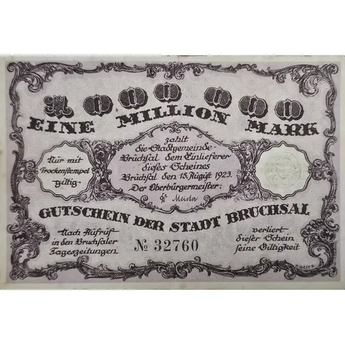 | 正面铭文 | 1 000 000 Eine Million Mark zahlt die Stadtgemeinde Bruchsal dem Einlieferer dieses Scheins. Bruchsal den 15. August 1923 |