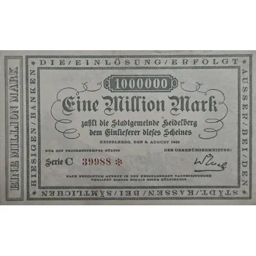 | Obverse lettering | Eine Million Mark zahlt die Stadtgemeinde Heidelberg dem Einlieferer dieses Scheins Heidelberg, den 8. August 1923 |