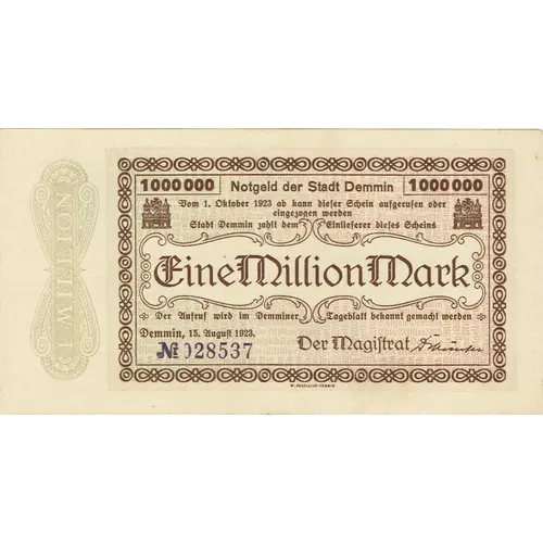 | Arka yüz açıklaması | A generalized depiction of the local town gate with the lettering `Eine Million Mark` (one million mark) in the center. Stamp signs can be present as they are visible in the image above (depends on the actual banknote). |