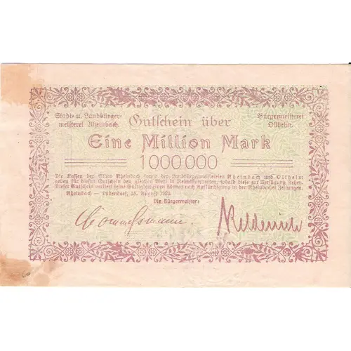 | نوشتههای روی اسکناس | Stadt u. Landburgermeisterei Rheinbach Burgermeisterei Ollheim Eine Million Mark Lundendorf , 15. August 1923. |