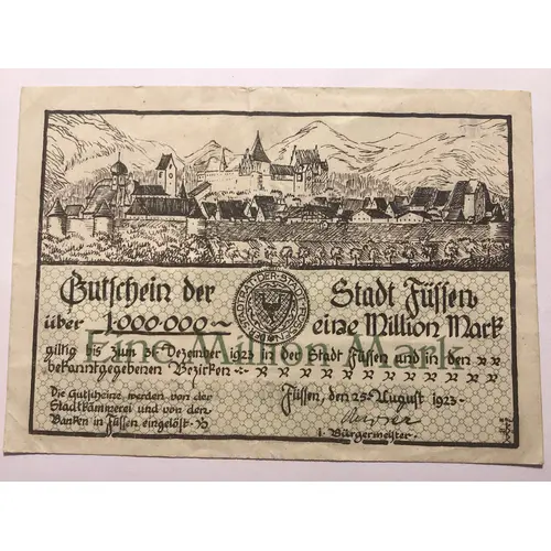 Gutschein der Stadt Füssen über 1.000.000-eine Million Mark Gültig Gabis zum 31.Dezember 1923 in der Stadt Füssen und in den bekanntgegebenen Bezirken Füssen,den 25.August 1923 Bürgermeister Die Gutscheine werden von der Stadtkammerei und von der Banken in Füssen eingelöst. |