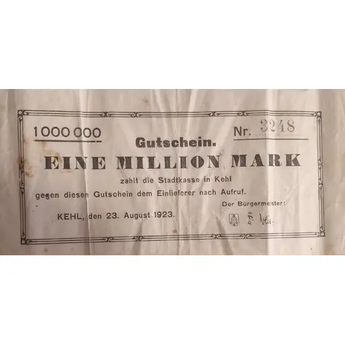 | Leyenda del anverso | 1 000 000 Gutschein Eine Million Mark Zahlt die Stadtkasse in Kehl gegen diesen Gutchein dem Einlieferer nach Aufurf KEHL, den 23 August 1923 |