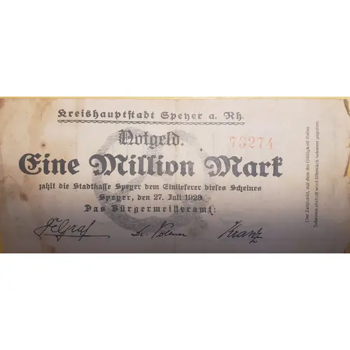 | Obverse lettering | kreishauptstadt Saeyer a. Rh. Notgeld Eine Million Mark zahlt die stadtkaffe Speyer dem Einlieferer dieles Scheines Speyer, den 27. Juli 1923 Das Bürgermeiheramt Der Zeitpunkt, mit dem die Gültigkeit dieles Scheines abläuft wird öffentlich bekannt gegeben |