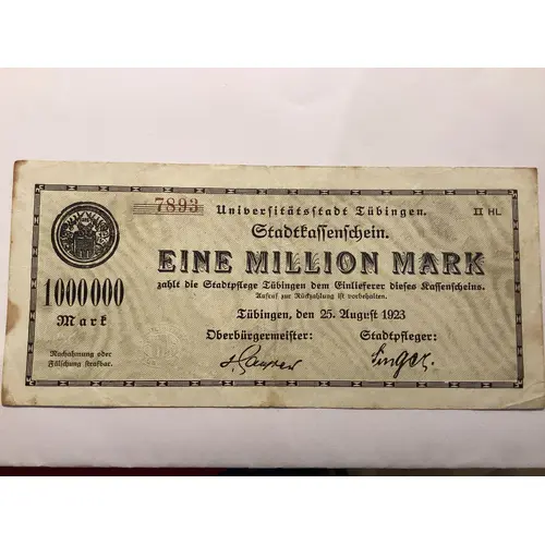 | Vorderseitenlegende | Universitasstadt Tubingen Stadtkassenschein. EINE MILLION MARK zahl die Stadtpflege Tubingen dem Einlieferer dieses Kassenscheins. Tubingen,den 25.August 1923 Oberburgemeister: Stadtpfleger: 1 000 000 Mark Nachahmung oder Falschung Strafbar. |