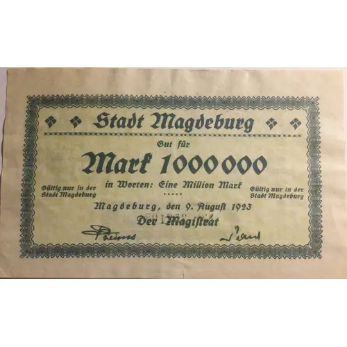 Obverse description Stadt Magdeburg.Gut fur Mark 1 000 000.in worten:Eine million mark,gultig nur in der Stadt Magdeburg.9.August 1923.Der Magistrat.