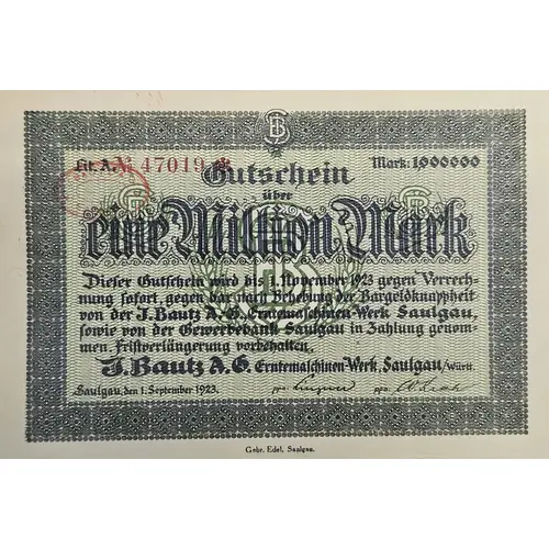 | Obverse lettering | Gutschein über eine Million Mark Dieser Gutschein wird bis 1. November 1923 gegen Verrechnung sofort, gegen bar nach Behebung der Bargeldknappheit von der J. Bautz A.-G., Erntemaschinen-Werk Saulgau, sowie von der Gewerbebank Saulgau in Zahlung genommen. Fristverlängerung vorbehalten. J. Bautz A. G. Erntemaschinen-Werk, Saulgau/Württ. Saulgau, den 1. September 1923 |