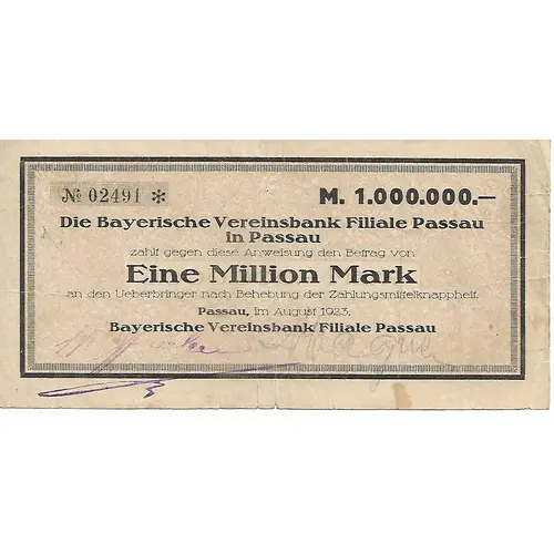 | Legenda awersu | Eine Million Mark (Translation: The Bavarian Vereinsbank branch in Passau 1,000,000 Mark) |