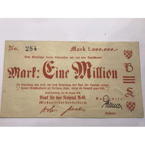 | Legenda do anverso | Mark 1.000.000.- Dem Einreicher dieses überweisen wir auf sein Bankkonto MARK:EINE MILLION Die Einreichung kann direkt oder durch Vermittlung einer Bank oder Sparkasse erfolgen.Soweit Reichsbanknoten zur Verfügung Stehen,erfolgt ein Umtausch gegen diese Birkenfeld =Nahe,den 20.August 1923 Ban für das Nahetal A=G.(Birkenfelder Landesbank) |