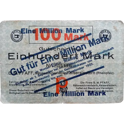 | Obverse lettering | PFAFF ⬩ KAISERSLAUTERN 100 MARK PFAFF ⬩ KAISERSLAUTERN Gutschein über Einhundert Mark Nr. 34116 G. m: PFAFF, Nähmaschinenfabrik, Kaiserslautern (Rheinpfalz). Zahlbar bei der Bayerischen Staatsbank in Kaiserslautern. Die Firma G. M . PFAFF, Nähmaschinenfabrik, Kaiserslautern, haftet mit Besitz und Vermögen für denBetrag dieses Scheines. Dieser Gutschein verliert seine Gültigkeit am 15.Dezember1922. P PFAFF Eine Million Mark Gut für Eine Million Mark in Worten Eine Million Mark Einlösbar ab 1. September bei der Süddeutschen Disconto Gesellschaft A. G. Kaiserslautern oder der Geschäftskasse von G. M. Pfaff Gültig bie zum 15. September 1923. |