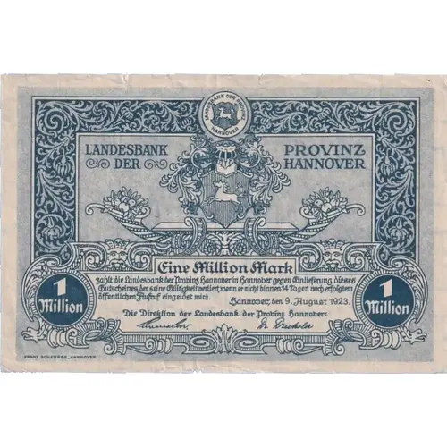 | Obverse lettering | LANDESBANK DER PROVINZ HANNOVER LANDESBANK DER PROVINZ HANNOVER Eine Million Mark zahlt die Landesbank der Provinz in Hannover gegen Einlieferung dieses Gutscheines der seine Gültigkeit verliert, wenn er nicht dinnen 14 Tagen nach erfolgten öffentlichen Aufruf eingelöst wird. Hannover, den 9. August 1923. Die Direktion der Landesbank der Provinz Hannover: 1 Million 1 Million FRANZ SCHERNER, HANNOVER |
