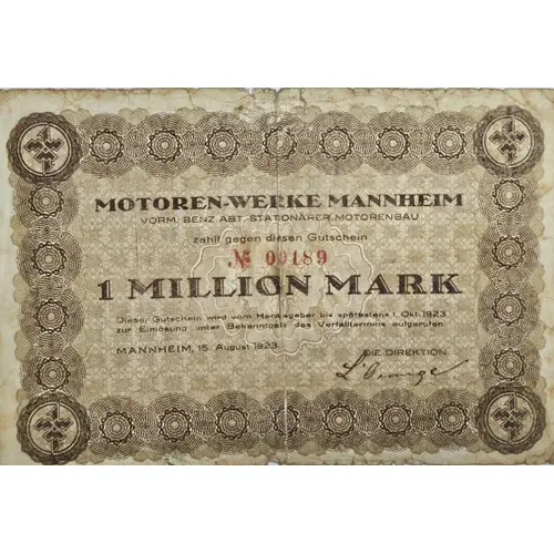 | Obverse lettering | Motoren-Werke Mannheim Vorm. Benz Abt. stationärer Motorenbau zahlt gegen diesen Gutschein 1 Million Mark Dieser Gutschein wird vom Herausgeber bis spätestens 1. Okt. 1923 zur Einlösung unter Bekanntgabe des Verfalltermins aufgerufen. Mannheim, 15. August 1923 |