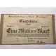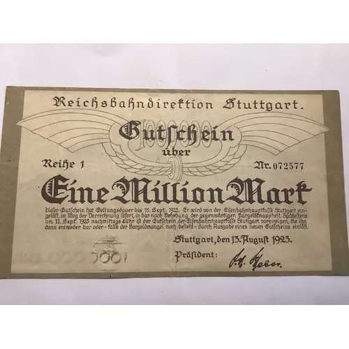 Reichsbahndirektion Stuttgart. Gutschein über EINE MILLION MARK Dieser Gutschein hat Beltungsdauer bis 11.Sept.1923.Er wird von der Eisenbahnhauptkasse Stuttgart eingelöst im Weg der Verrechnung Sofort,in bar nach Behebung der gegenwärtigen Bargeldknappheit.Spätestens am 11.Sept.1923 nachmittags 4Uhr ist der Gutschein der Eisenbahnhauptkasse Stuttgart vorzuzeigen,die ihn dann entweder bar oder-falls der Bargeldmangel noch besteht-durch Ausgabe eines neuen Gutscheins einlöst. Stuttgart,den 13.August 1923. Präsident: |