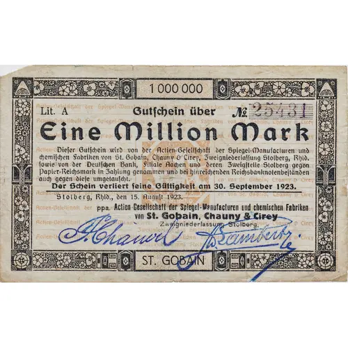 1000000 Lit. A Gutschein über N° Eine Million Mark Dieser Gutschein wird von der Actien-Gesellschaft der Spiegel Manufacturen und chemischen Fabriken von St. Gobain, Chauney & Cirey, Zweigniederlassung Stolberg, Rhld. Sowie von der Deutschen Bank, Filiale Aachen und deren Zweigstelle Stolberg gegen Papier-Reichsmark in Zahlung genommen und bei hinreichenden Reichsbanknotenbeständen auch gegen diese umgetauscht. Der Schein verliert seine Gültigkeit am 30. September 1923. Stolberg, Rhld., den 15.08.1923. ppa. Actien-Gesellschaft der Spiegel-Manufacturen und chemischen Fabriken von St. Gobain, Chauney & Cirey Zweigniederlassung Stolberg. ST. GOBAIN (Saint-Gobain, Saint Gobain) |