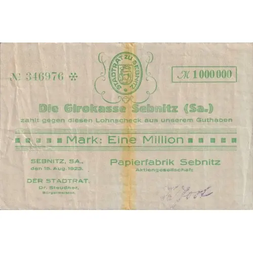 | Obverse lettering | Die Girokasse Sebnitz (Sa.) zahlt gegen diesen Lohnscheck aus unserem Guthaben Mark: Eine Million Papierfabrik Sebnitz Aktiengesellschaft Sebnitz, Sa., den 15. Aug. 1923, Der Stadtrat, Dr. Steudner, Bürgermeister. |