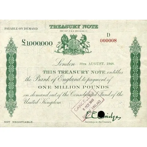 PAYABLE ON DEMAND TREASURY NOTE PER ACT 2 & 3 GEO. 6 CH.117 £1,000,000 HONI SOIT QUI MAL Y PENSE DIEU ET MON DROIT London 30TH AUGUST, 1948. THIS TREASURY NOTE entitles the Bank of England to payment of ONE MILLION POUNDS on demand out of the Co0nsolidated Fund of the United Kingdom NOT NEGOTIABLE [signature] Secretary to the Treasury (Translation: Shame on he who thinks evil of it God and my right) |