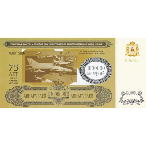 | 正面铭文 | ЮБИЛЕЙНЫЙ ВЫПУСК К 75-ЛЕТИЮ OAO `НИЖЕГОРОДСКИЙ АВИАСТРОИТЕЛЬНЬІЙ ЗАВОД `СОКОЛ` ЗАВОЦ ПОТОЯННЬІЙ УЧАСТНИК МЕЖЦУАРОЦНЬІX АВИАСАЛООВ 75 ДЕТ ОАО `НАЗ `CОKOЛ` 1932-2007 АВИАРУБЕЙ 1000000 АВИАРУБЕЙ (Translation: ANNIVERSARY ISSUE FOR THE 75TH ANNIVERSARY OF THE NIZHNY NOVGOROD AIRCRAFT PLANT `SOKOL` ZAVOC PERMANENT PARTICIPANT INTERNATIONAL AIRLINES 75 `FALCON` 1932-2007 AVIATION ROUBLES 1000000 AVIATION ROUBLES) |