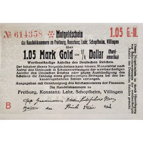 | Obverse lettering | Notgeldschein Der Hahandelskammer zu Freiburg, Konstanz, Lahr, Schopfheim, Villingen 1.05 Mark Gold = 1/4 Dollar Legal writing Signitures |