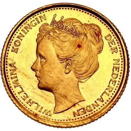 Portrait of Queen Wilhelmina of the Netherlands with diadem facing left surrounded by text in Dutch |