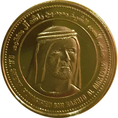 Head of Sheikh Mohammed bin Rashid Al Maktoum facing right encircled, and his name in Arabic above, and in English below |