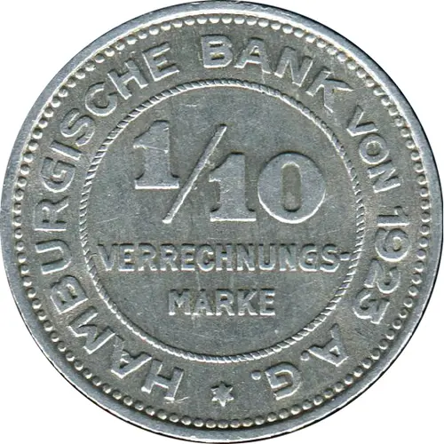 | Obverse lettering | HAMBURGISCHE BANK VON 1923 A.G. 1/10 VERRECHNUNGS- MARKE ✶ |