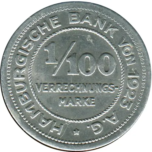 Obverse lettering HAMBURGISCHE BANK VON 1923 A.G. 1/100 VERRECHNUNGS- MARKE ★