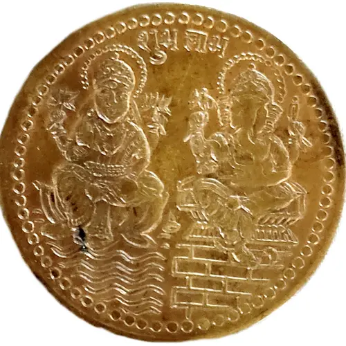 Shubh Labh written at top along rim in Devanagari script Below left is Goddess Laxmi sitting on a lotus flower with stylised waves Right is Lord Ganesh sitting on a pedestal placed on a brick wall Beads along the rim |