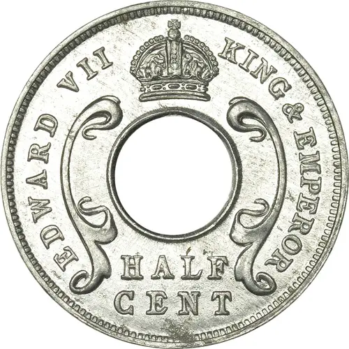 Artistry: The obverse features the uncrowned bust of King Edward VII, facing right, a design commonly attributed to George William de Saulles, Chief Engraver at the Royal Mint. His work exemplifies the late Victorian and early Edwardian neo-classical style prevalent in British numismatics, emphasizing regal dignity and clear portraiture. The reverse design, likely executed by Royal Mint engravers, presents the denomination "1/2 CENT" within a decorative wreath, flanked by "EAST AFRICA" and the date "1908", a functional and clear colonial type design.
