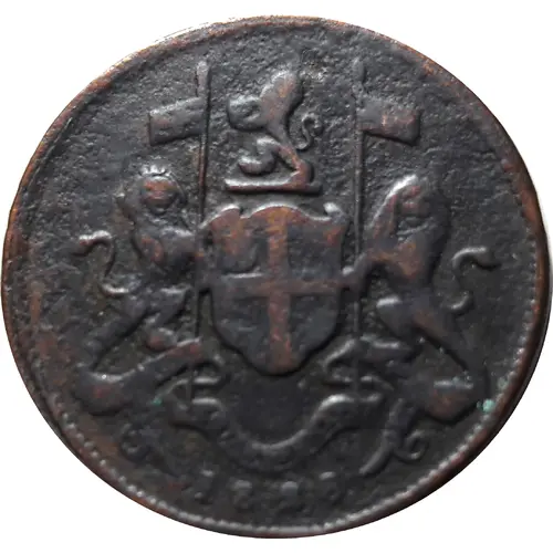 Obverse description British East India Company coat of arms with supporters. Lion rampant holding a crown between its fore paws above shield. Date Below. Beads around border.