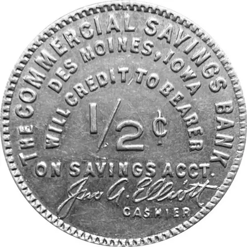 | Obverse lettering | THE COMMERCIAL SAVINGS BANK DES MOINES, IOWA WILL CREDIT TO BEARER 1/2¢ ON SAVINGS ACCT. JNO A. ELLIOTT (Script) CASHIER |