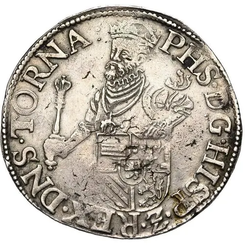 | Obverse description | Half-length figure of Philip II left, crowned and holding scepter in right hand, left hand resting on quartered arms of Spain-Burgundy-Austria. |